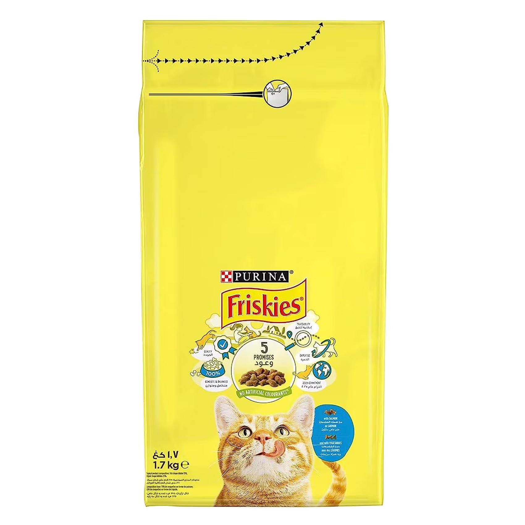 Purina Friskies with Salmon is a flavorful dry cat food featuring real salmon for a savory taste cats love, combined with crunchy kibble and vegetable accents for engaging texture in every meal. It delivers 100% complete nutrition with proteins for muscle health, fibers for digestion, and essential minerals to support urinary tract wellness and strong bones.